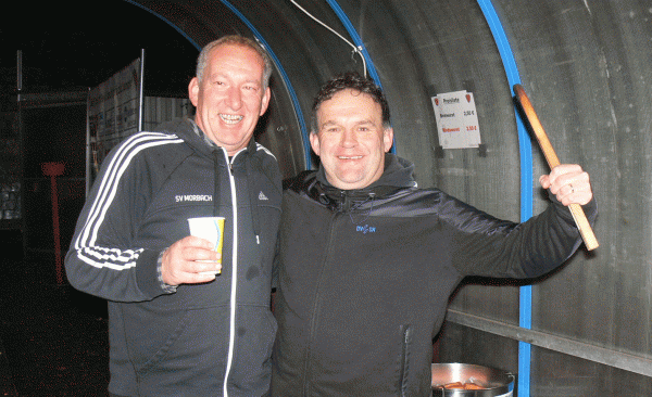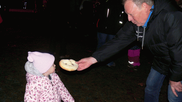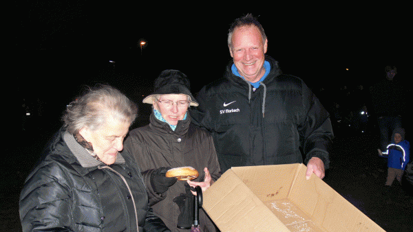 Am stimmungsvollen Martinsfeuer wurde den Umzugsteilnehmern im Alfons-Jakobs-Stadion eine Bewirtung mit leckerem Glühwein und Würsten geboten.
