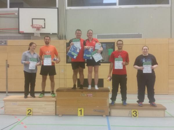 Im gemischten Doppel starteten Silvio mit Mareike Raul und Gerd mit Rosi Göhl. Auch dort wurde in Gruppenspielen begonnen und der SVM zeigte seine Stärke in dieser Disziplin. Für beide galt es nach den ersten beiden Siegen auch das dritte Gruppenspiel zu gewinnen, damit man sich im Halbfinale aus dem Weg gehen konnte. Gerd und Rosi legten vor und schlugen das ebenfalls mit zwei Siegen dastehende Mixed vom PST Trier und sicherten sich den 1. Platz in Ihrer Gruppe. Silvio und Mareike mussten ebenfalls gegen ein Paar vom PST Trier ran. Leider konnten Sie das Spiel nicht für sich entscheiden und belegten Platz 2 in Ihrer Gruppe.